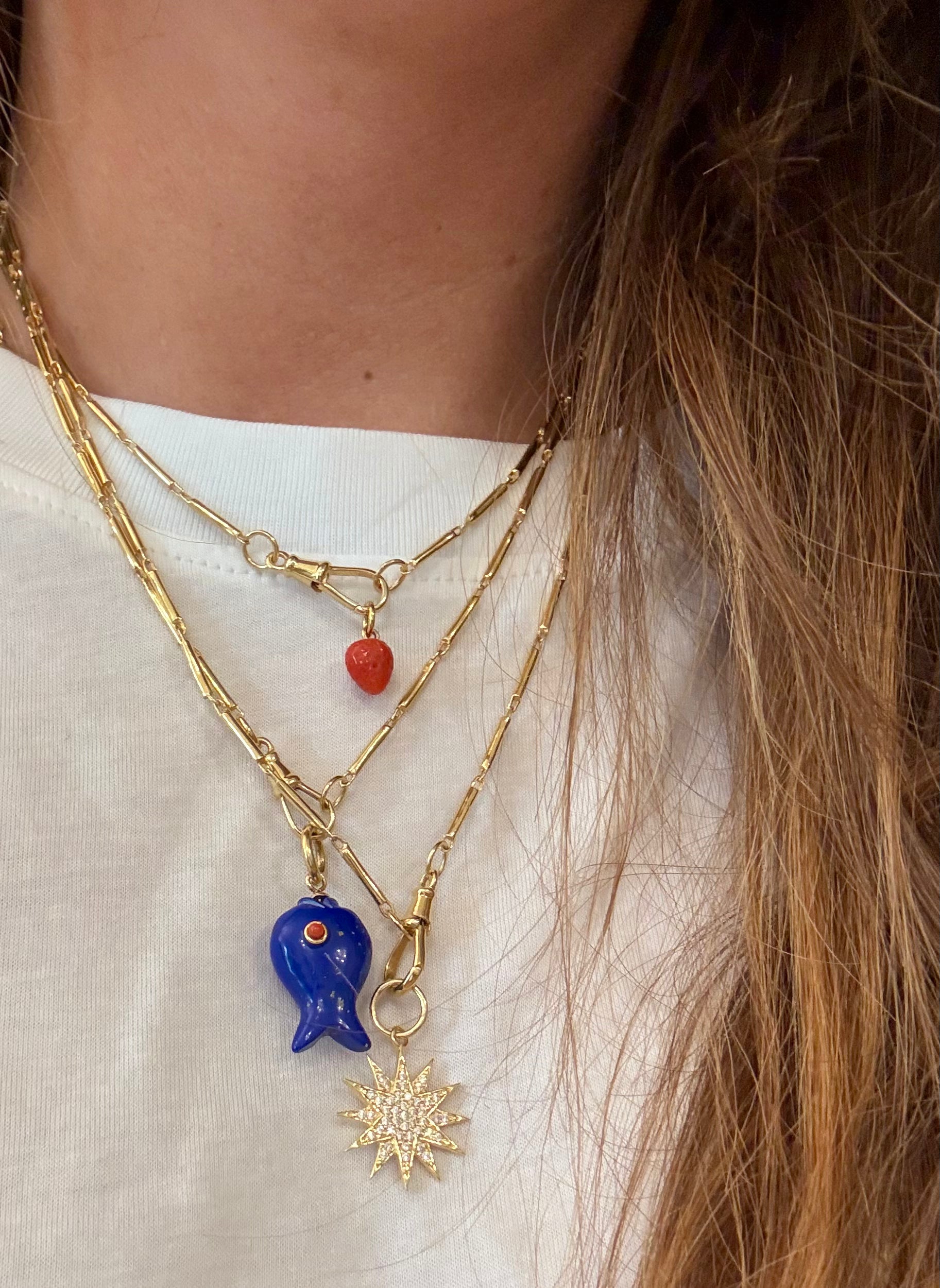 La caratteristica di questa collana è la chiusura a gancio, progettata per inserire uno o più ciondoli.