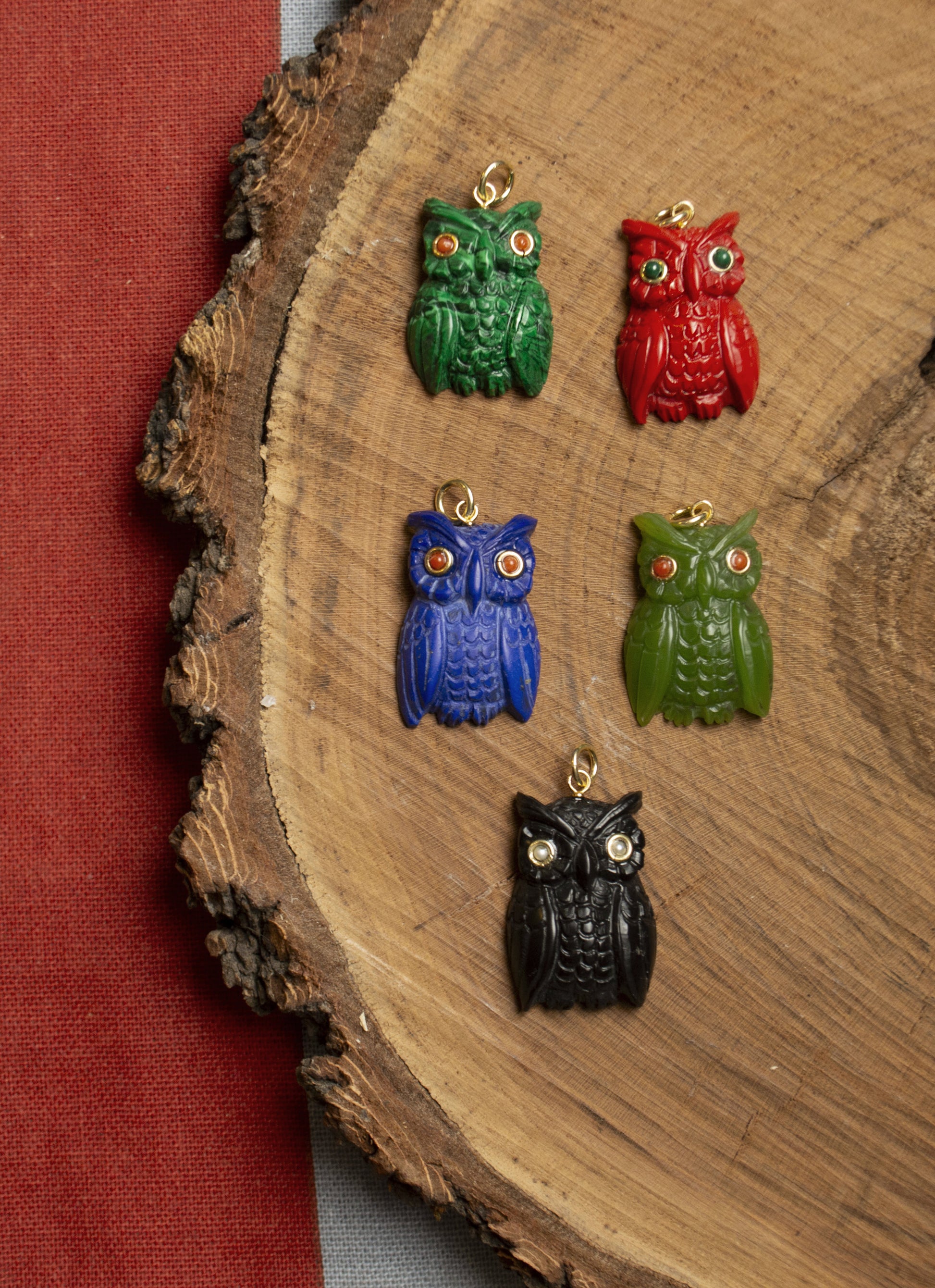 Ciondolo civetta con inserti in corallo naturale, malachite e perle