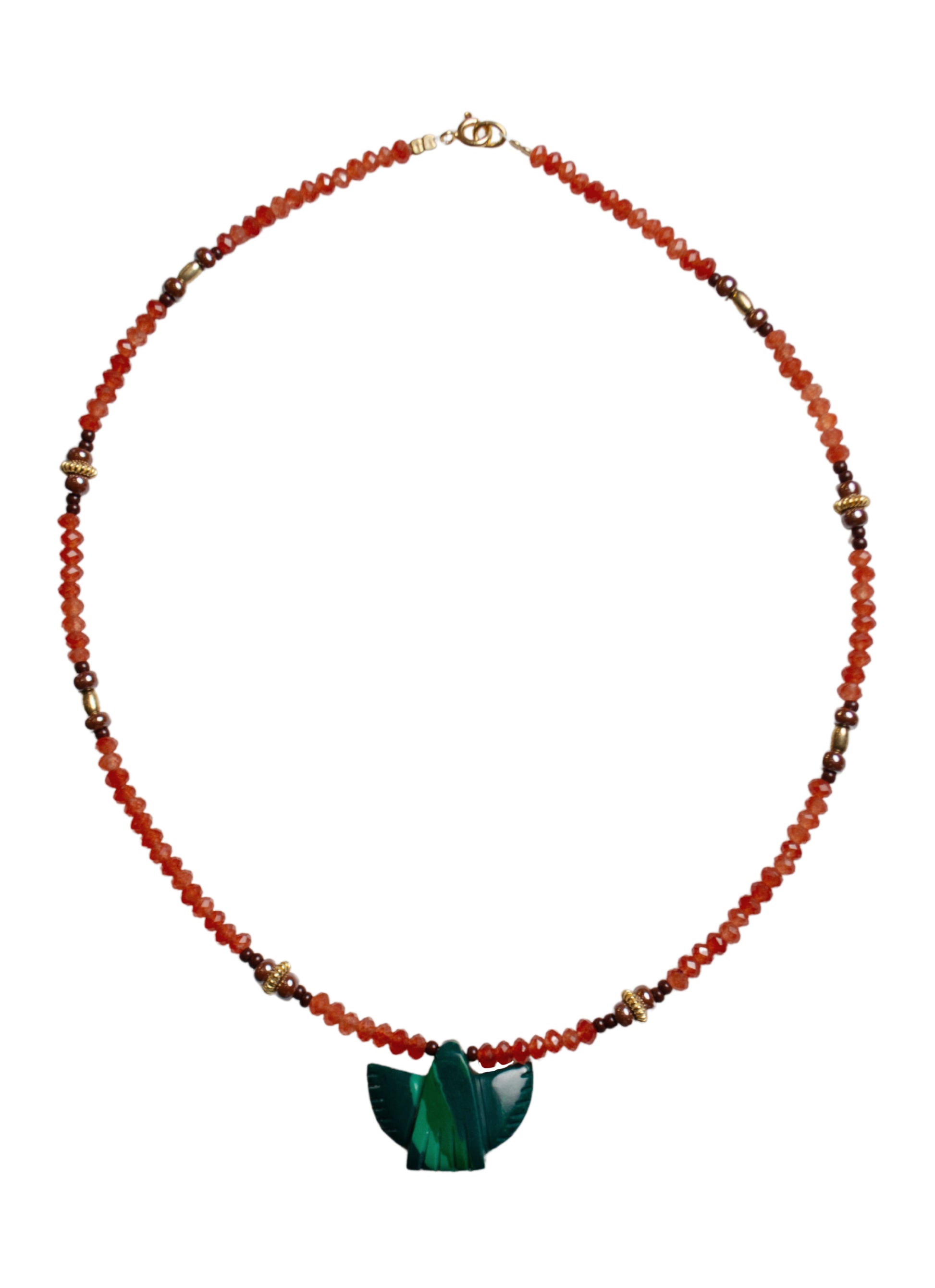Collana con corniola, perline in vetro, intermezzi in argento dorato.