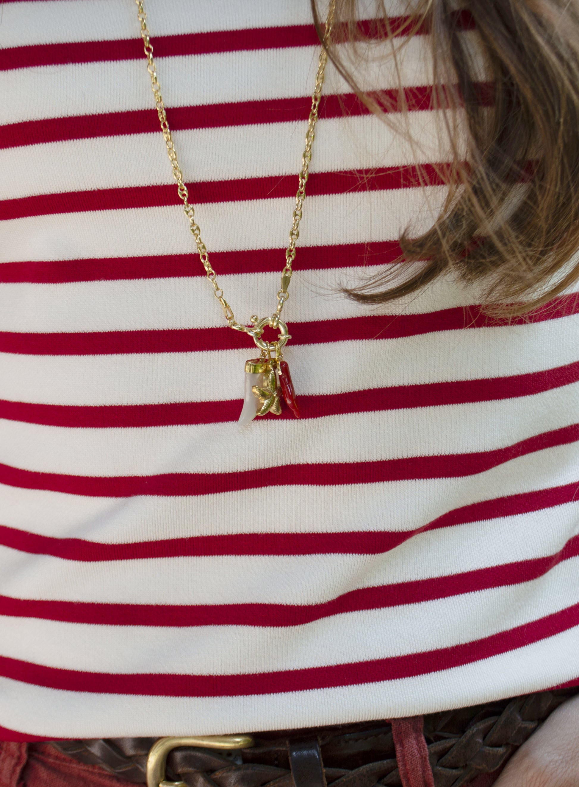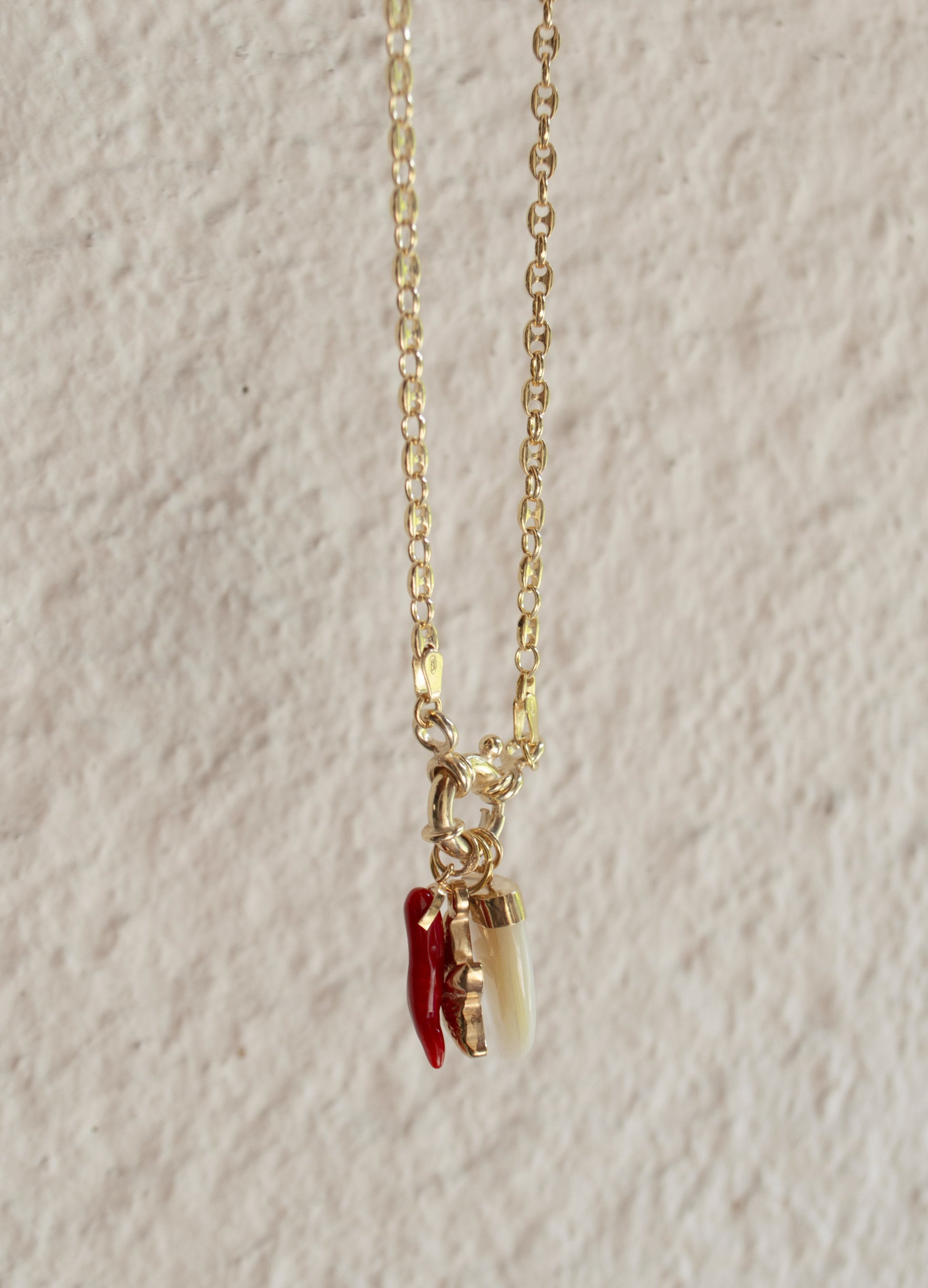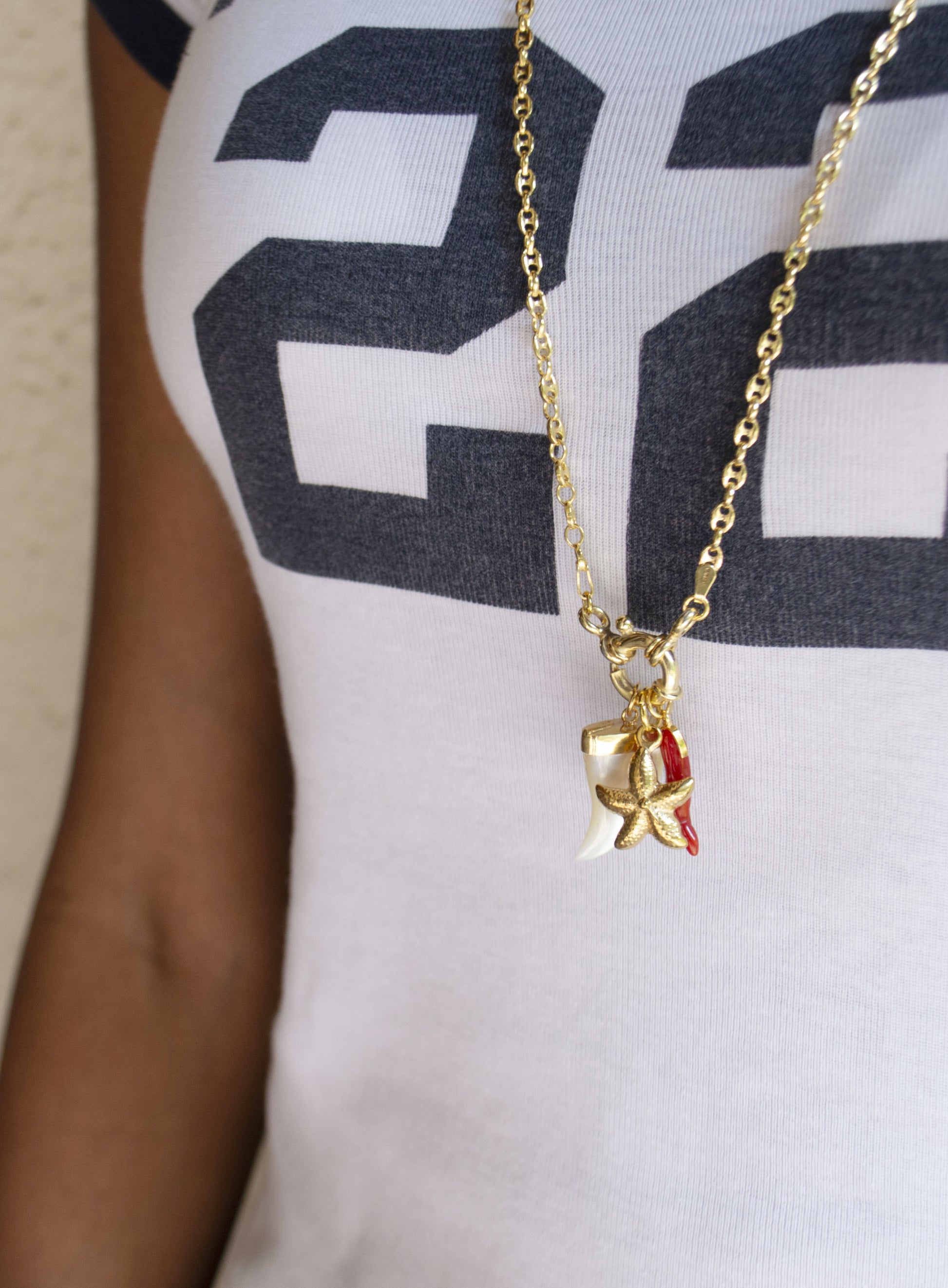 Ciondolo in corallo rosso, stella in ottone, zanna in madreperla