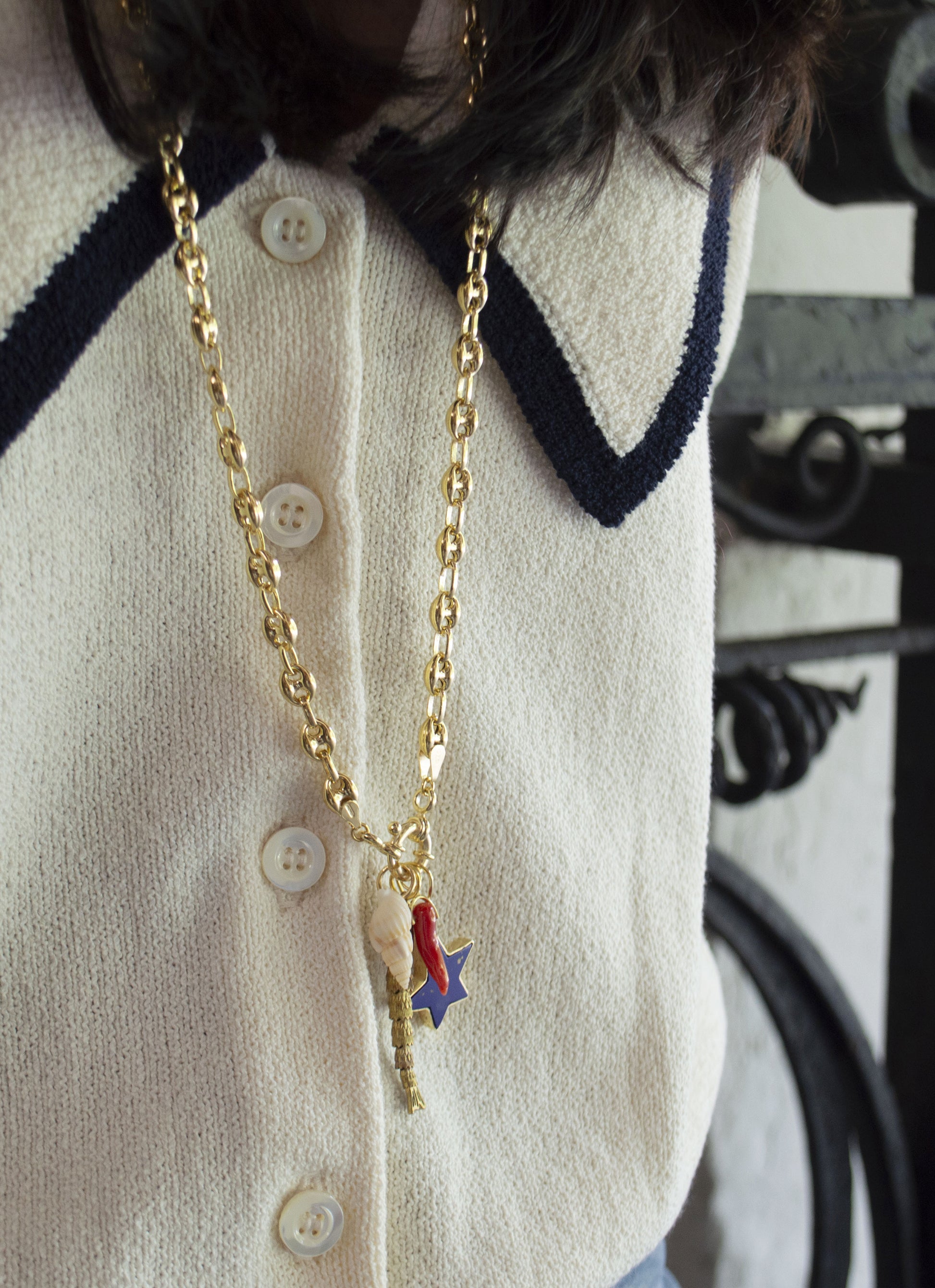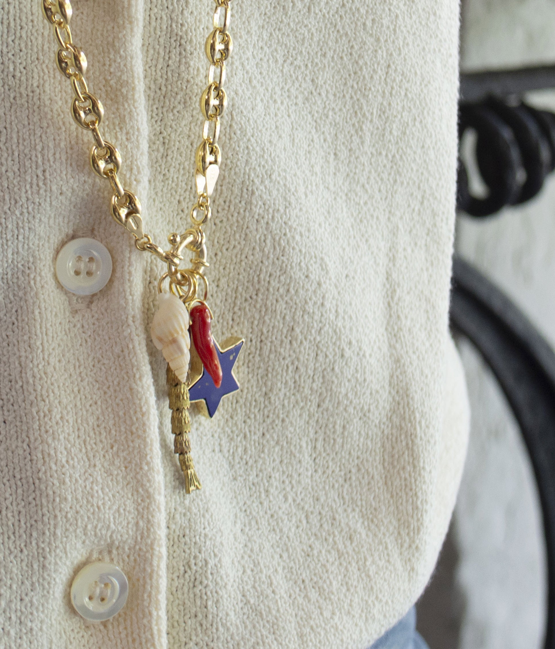 Ciondolo in corallo rosso, stella con lapis blu in argento 925 dorato 18 carati, pesce in ottone con zircone verde, conchiglia naturale.