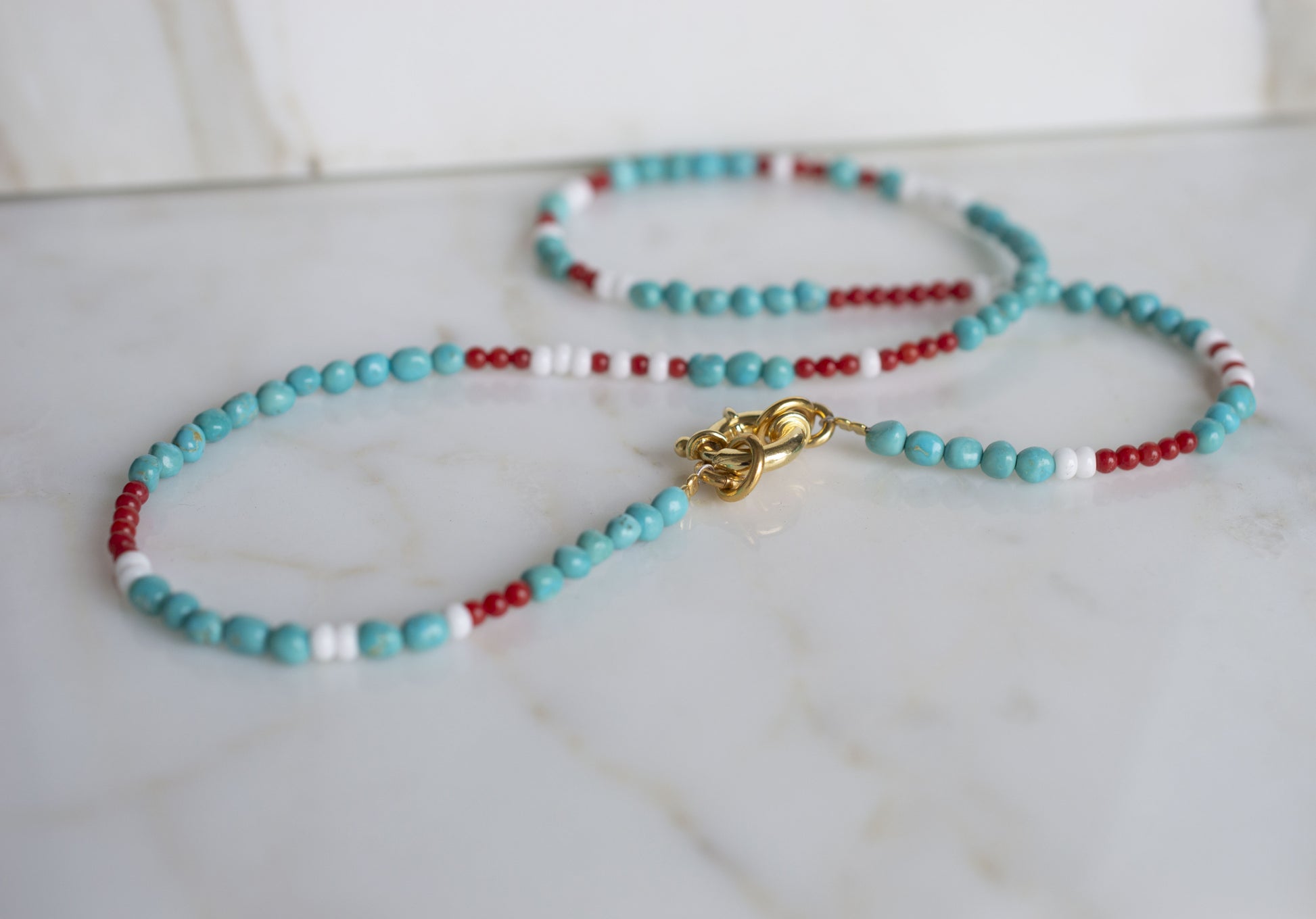 Perline di turchese e corallo rosso naturale, perline bianche in vetro - 52 cm