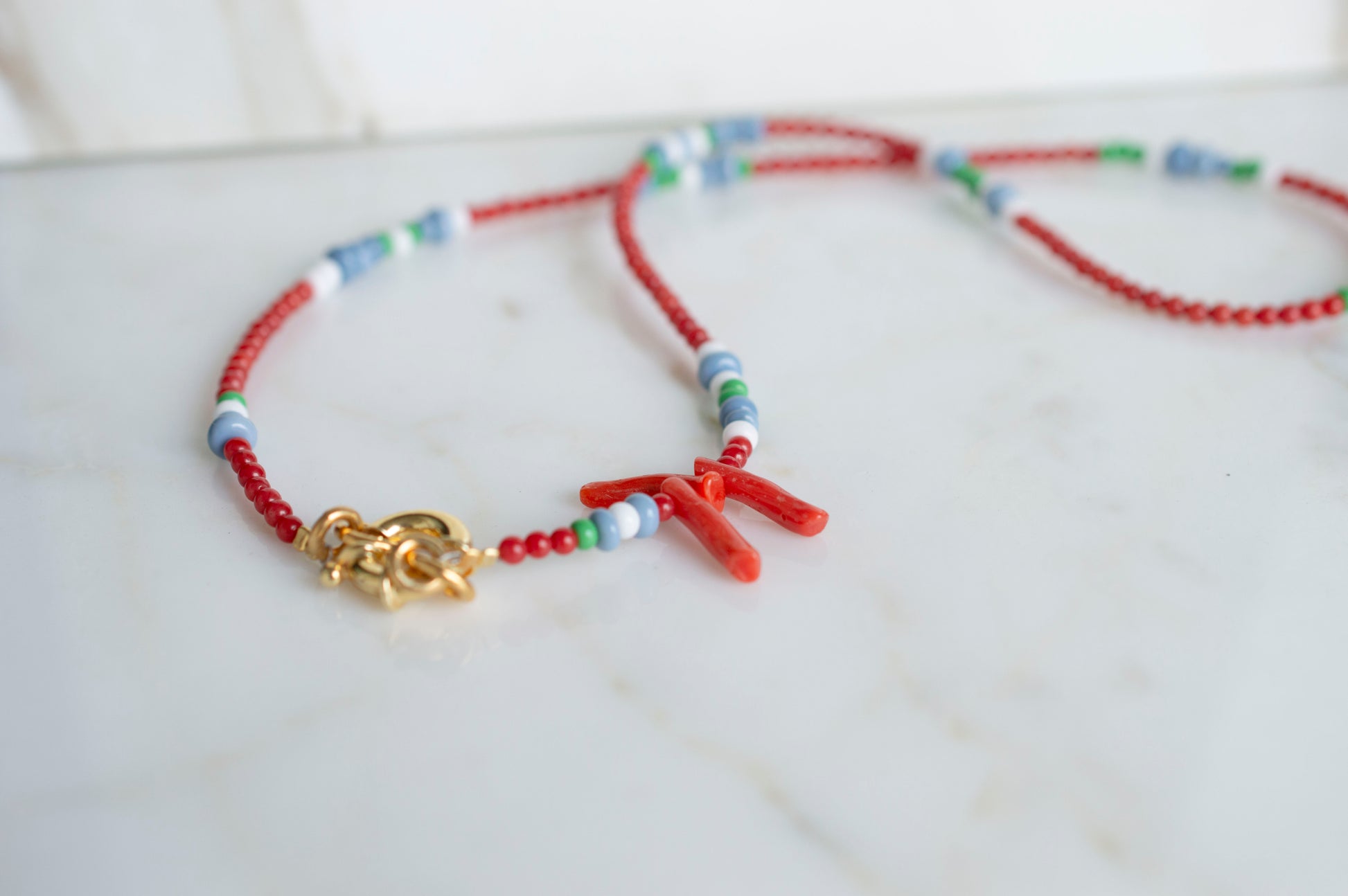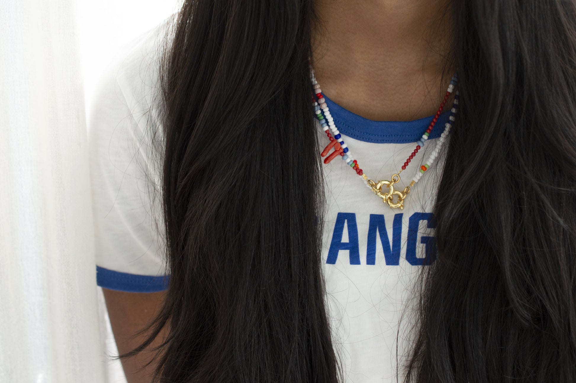 La caratteristica di questa collana è la chiusura a gancio (in argento dorato 18 carati), progettata per inserire uno o più ciondoli.