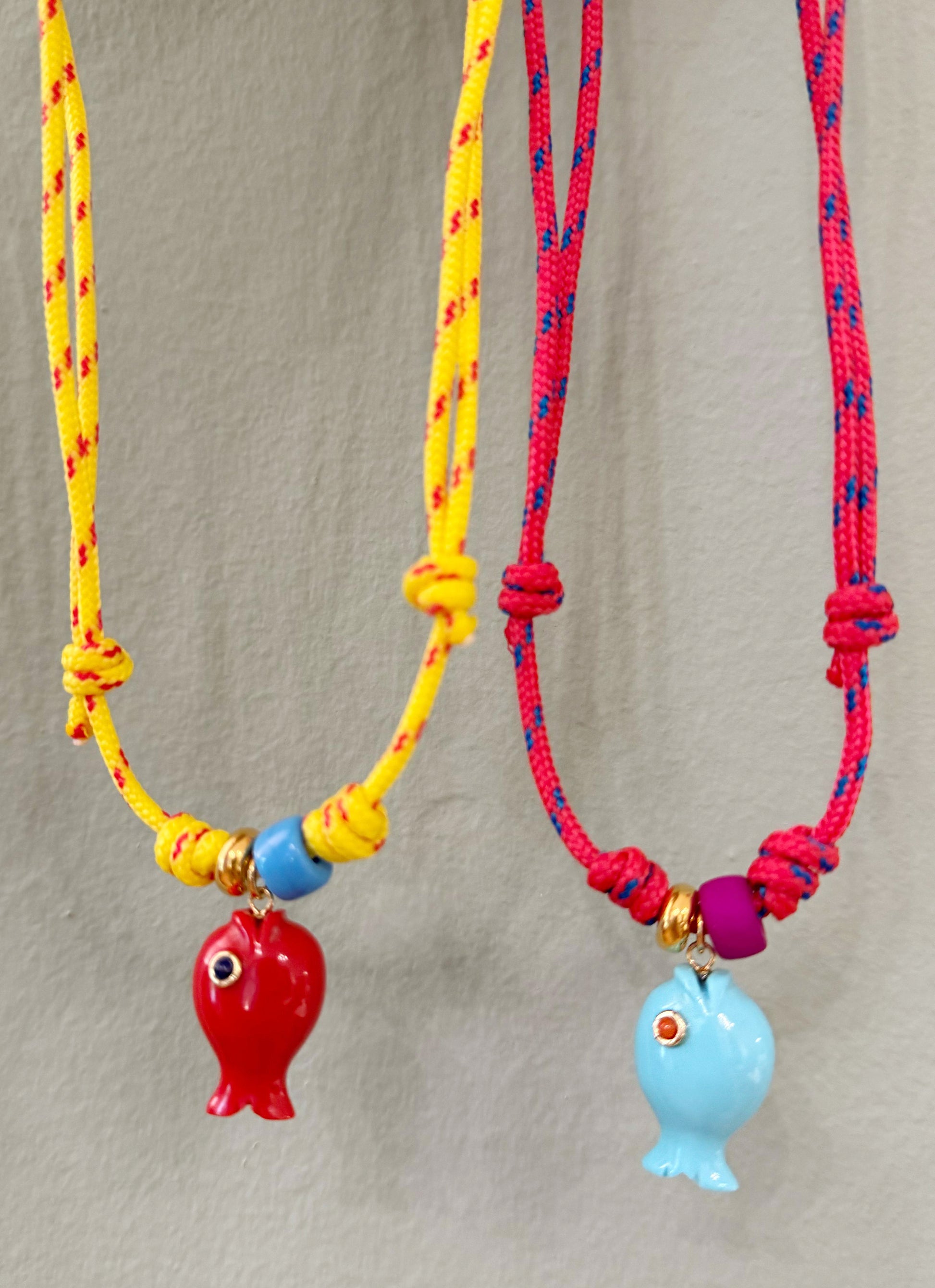 Cima nautica in nylon regolabile con perline in vetro veneziano e inserti in argento 925 dorato 18 carati.