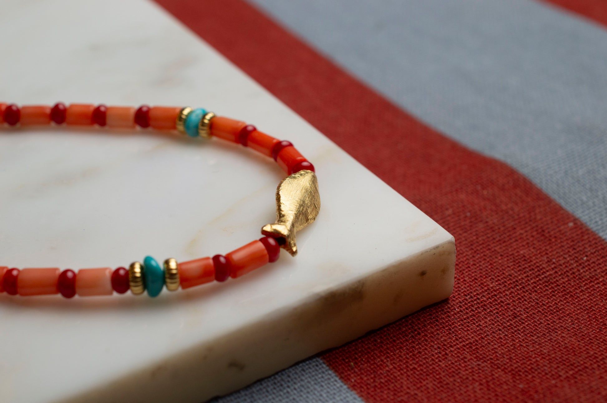 Collana con elementi in corallo rosa, corallo rosso e turchese.