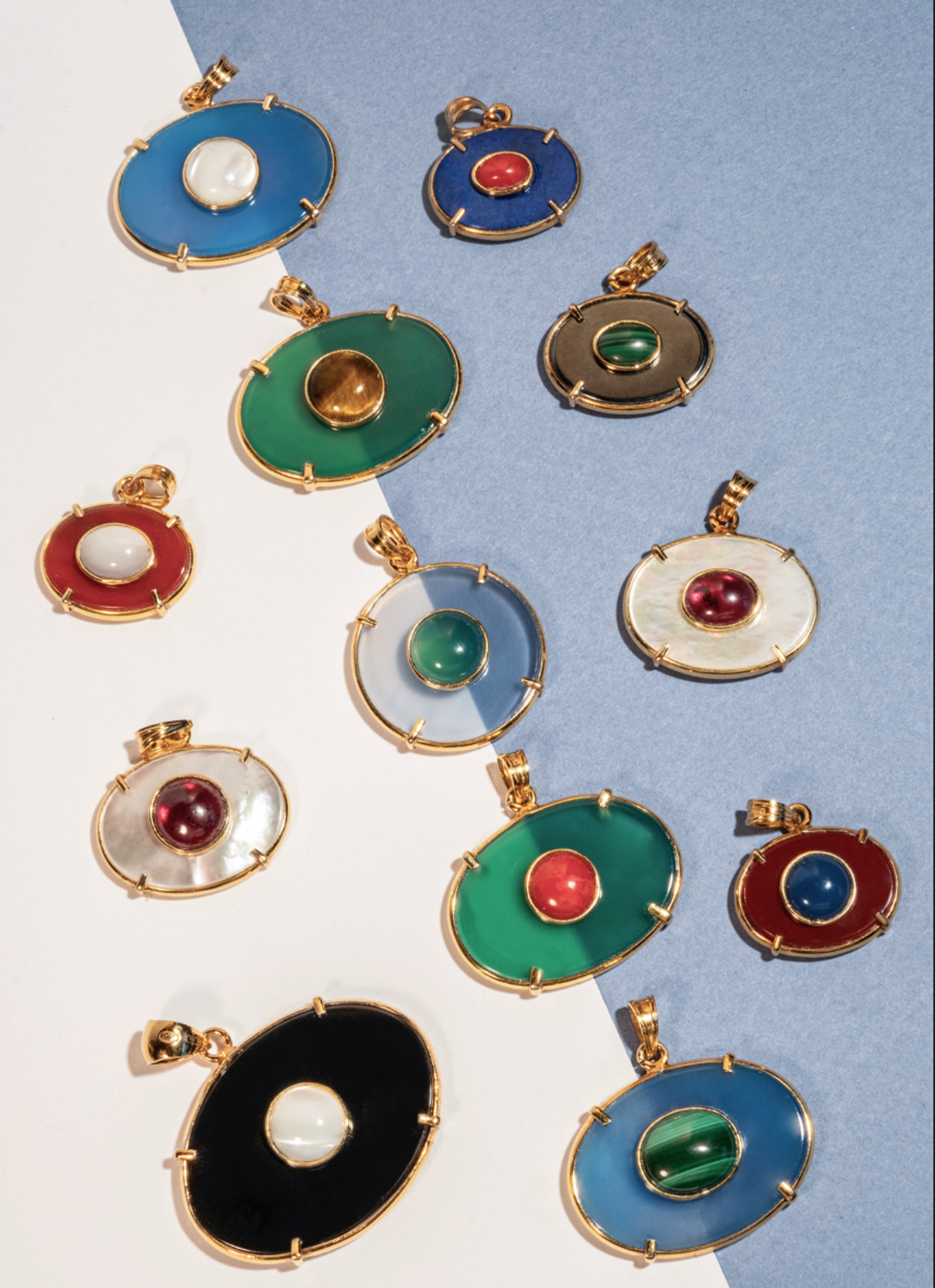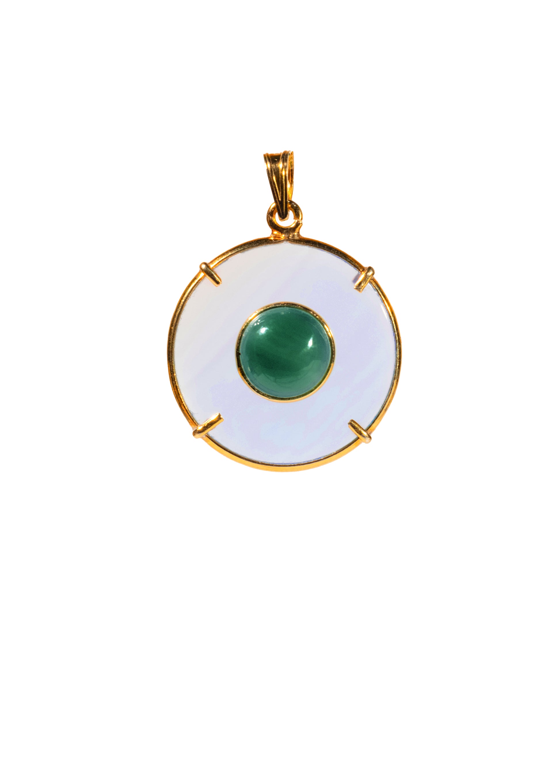 Ciondolo in agata blu con al centro cabochon in agata verde, argento 925 dorato 18 carati.