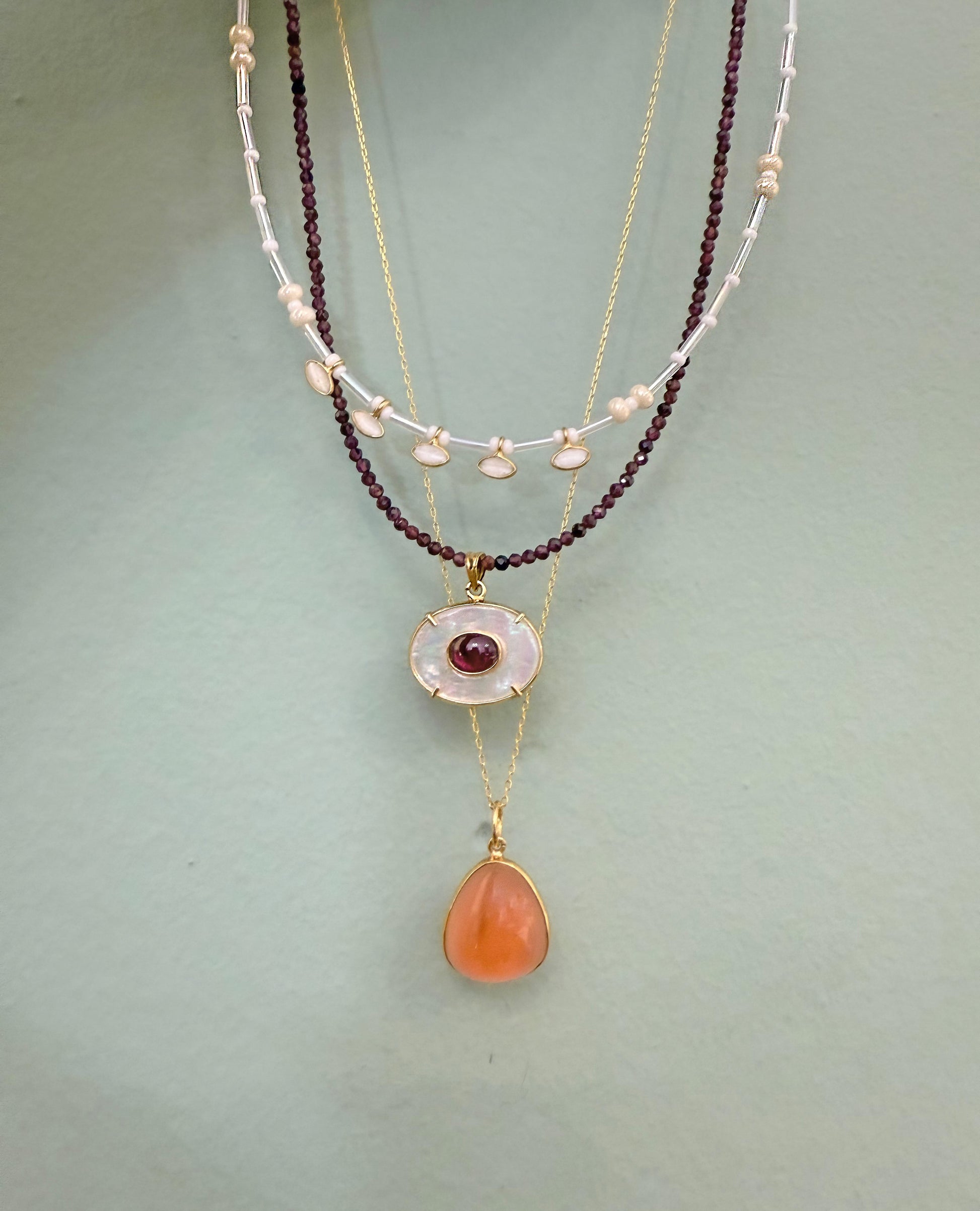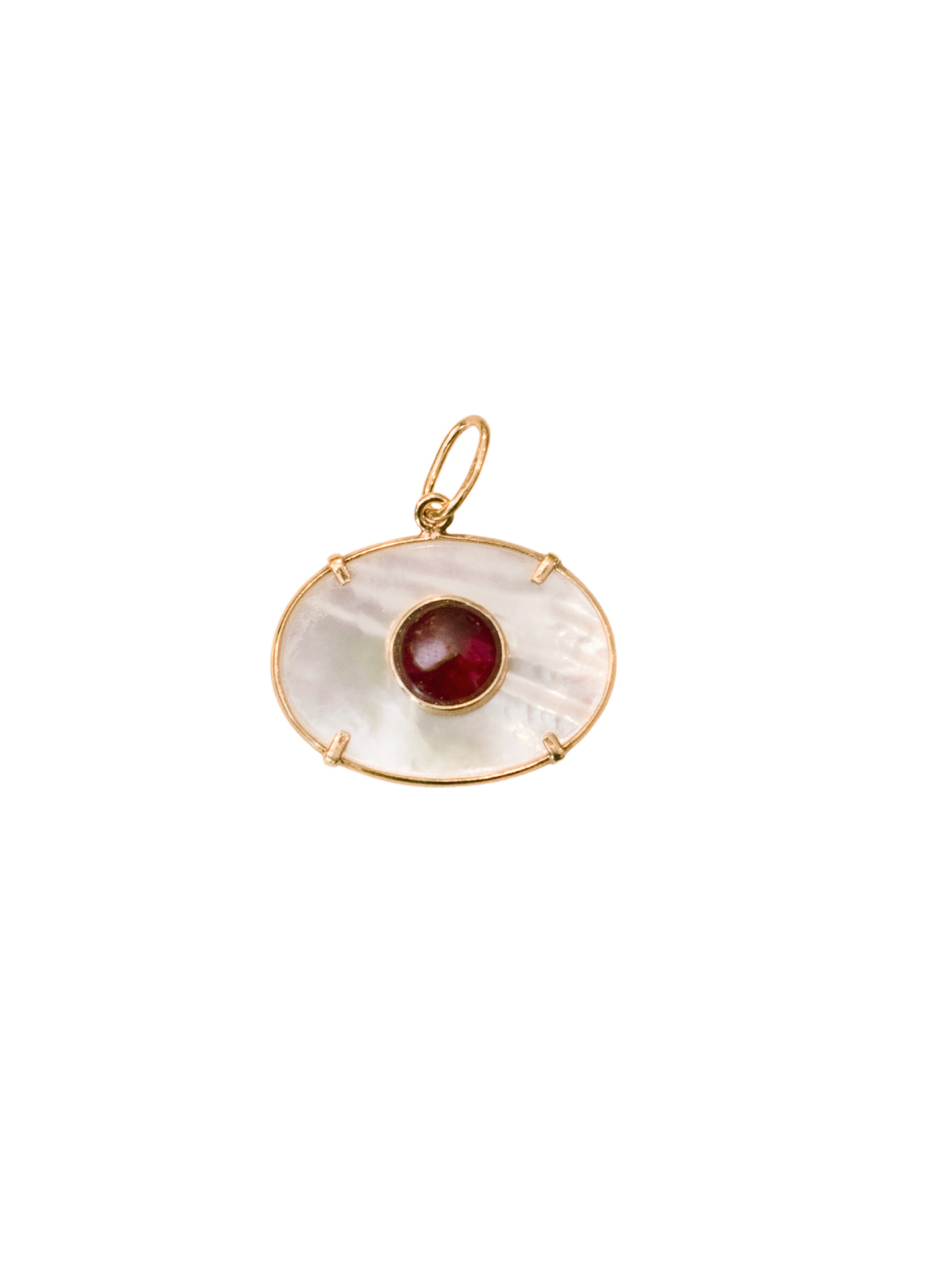 Ciondolo in madreperla con al centro cabochon in granato rosso, argento 925 dorato 18 carati.