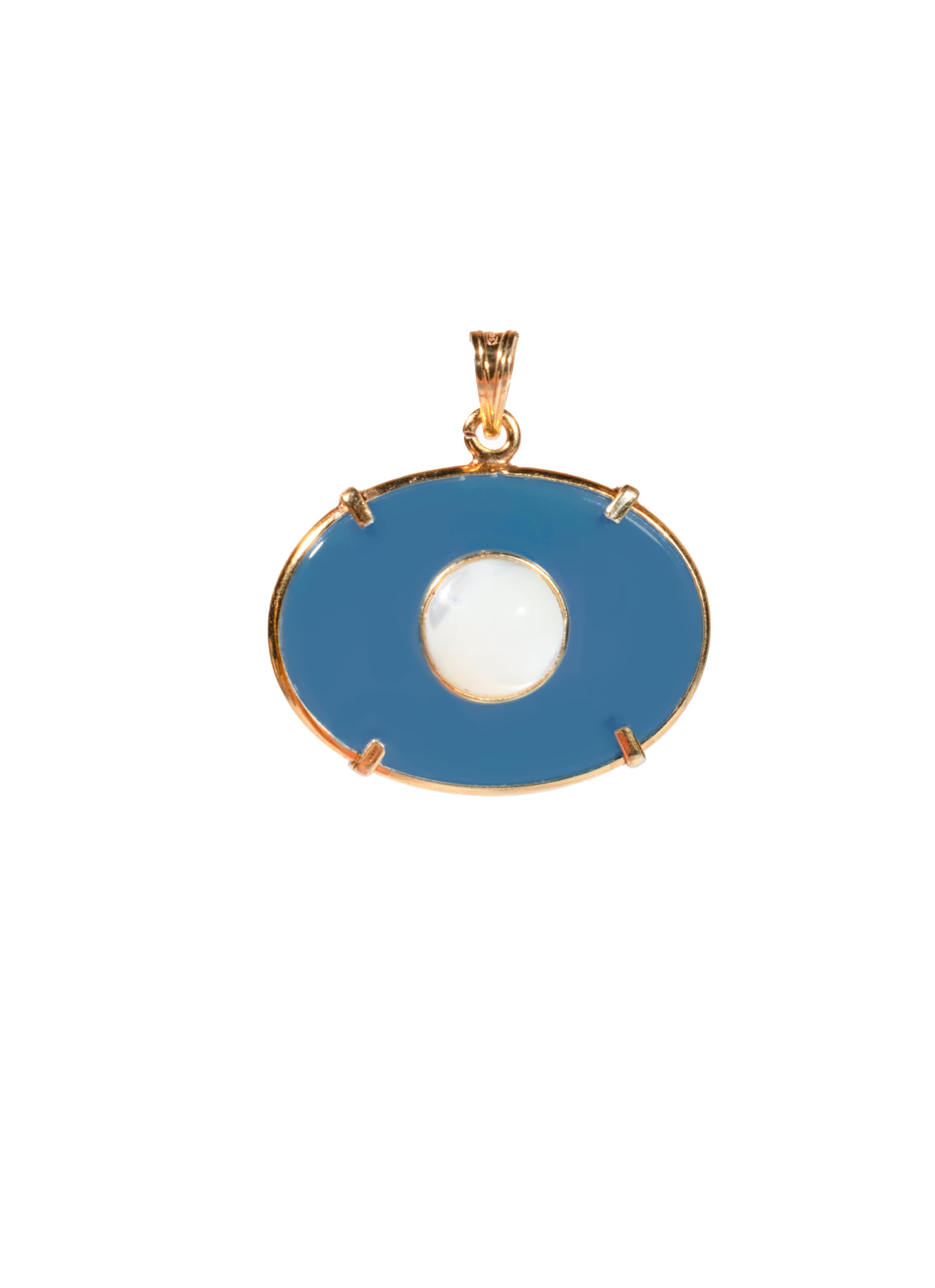 Ciondolo in agata blu con al centro cabochon in madreperla, argento 925 dorato 18 carati.