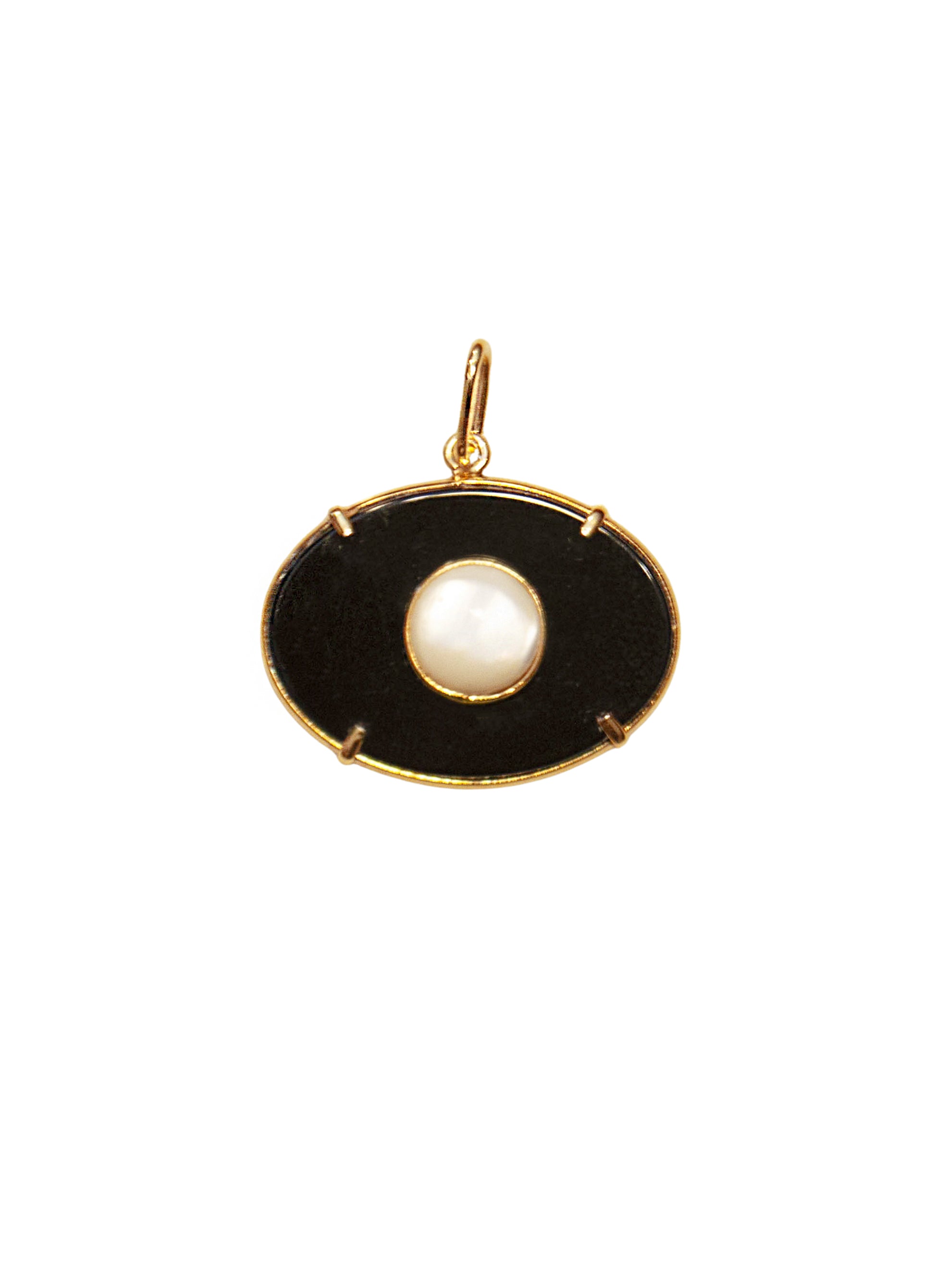 Ciondolo in ematite con al centro cabochon in madreperla, argento 925 dorato 18 carati.
