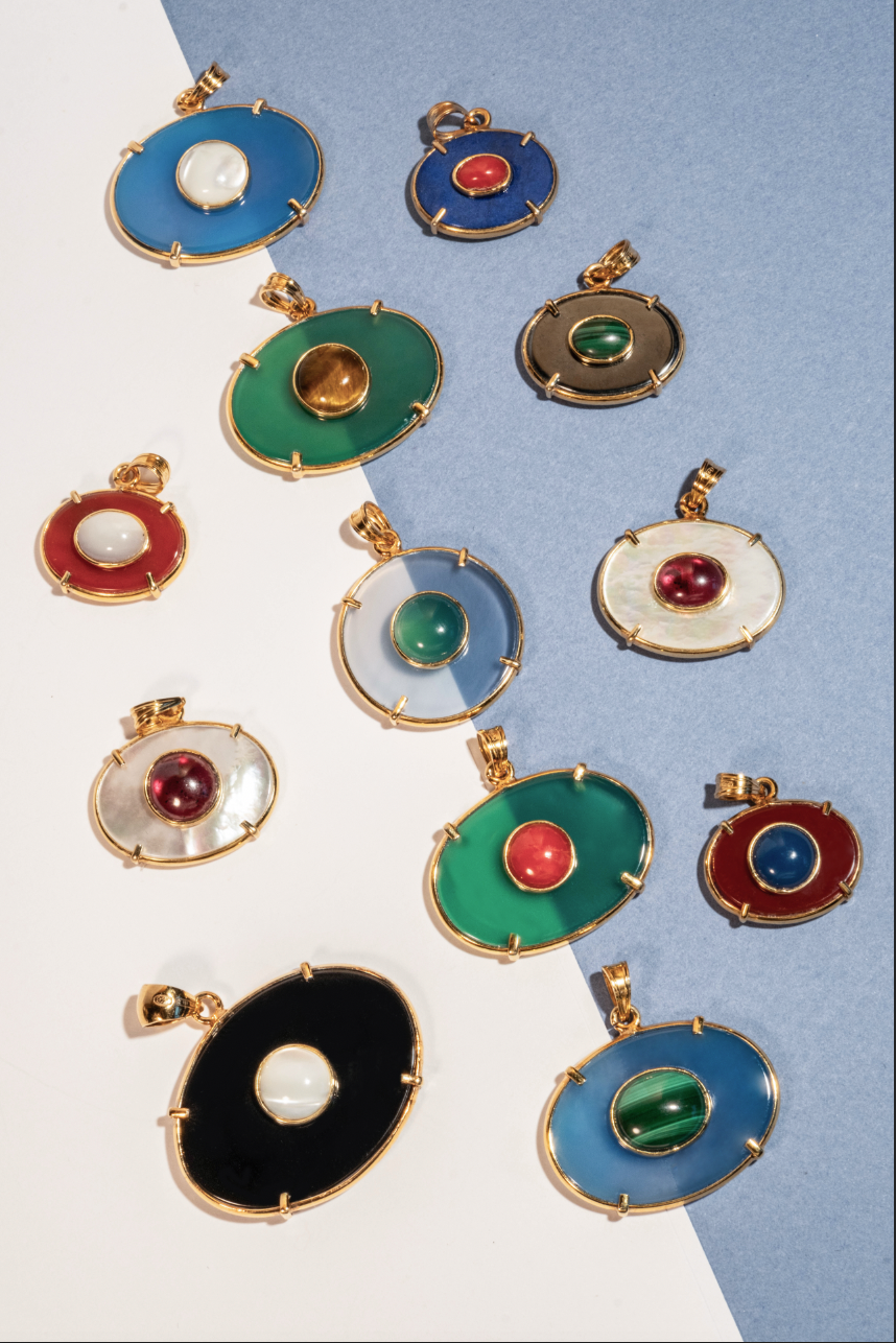 Ciondolo in lapis blu con al centro cabochon in corallo rosso, argento 925 dorato 18 carati.