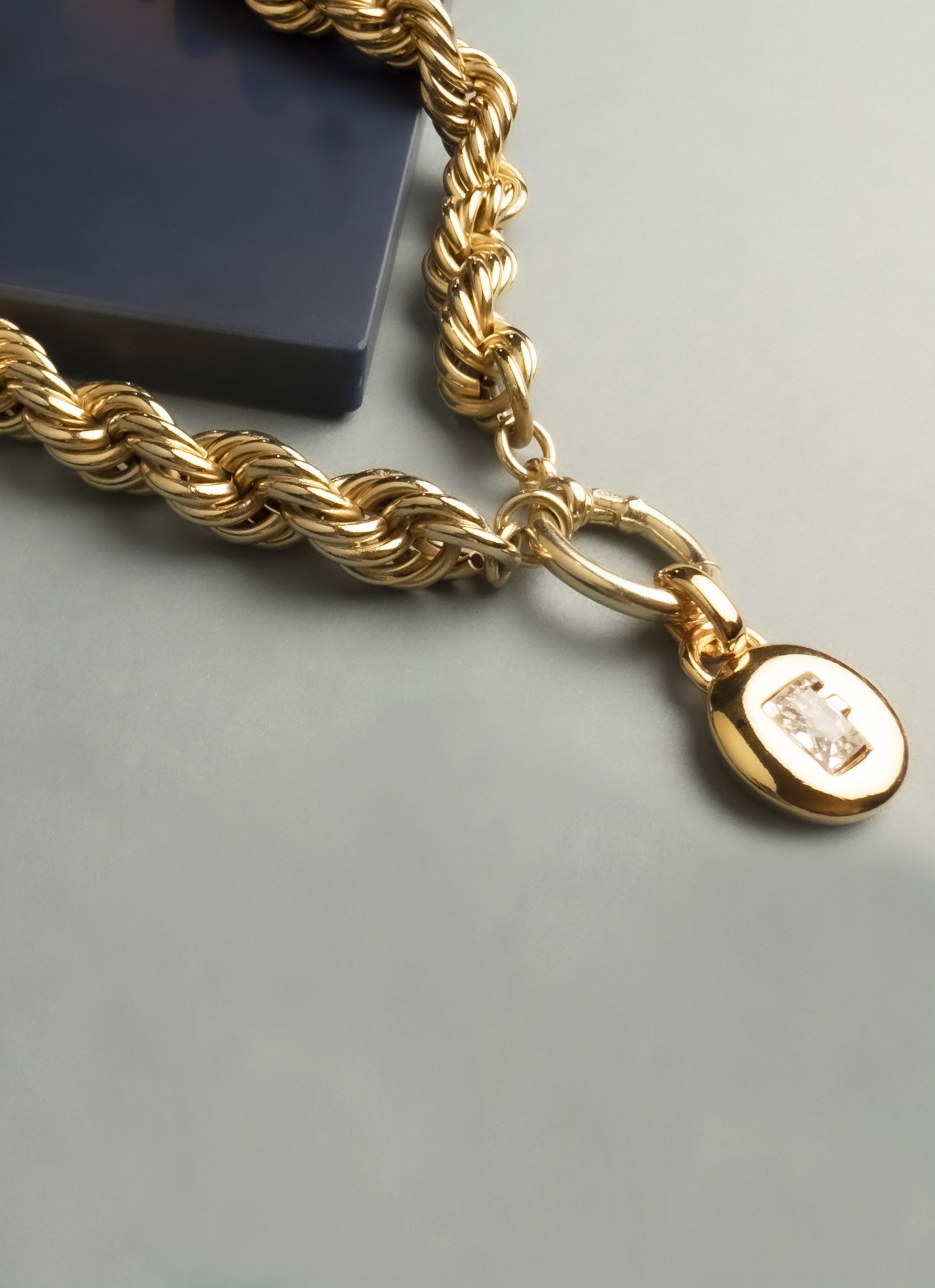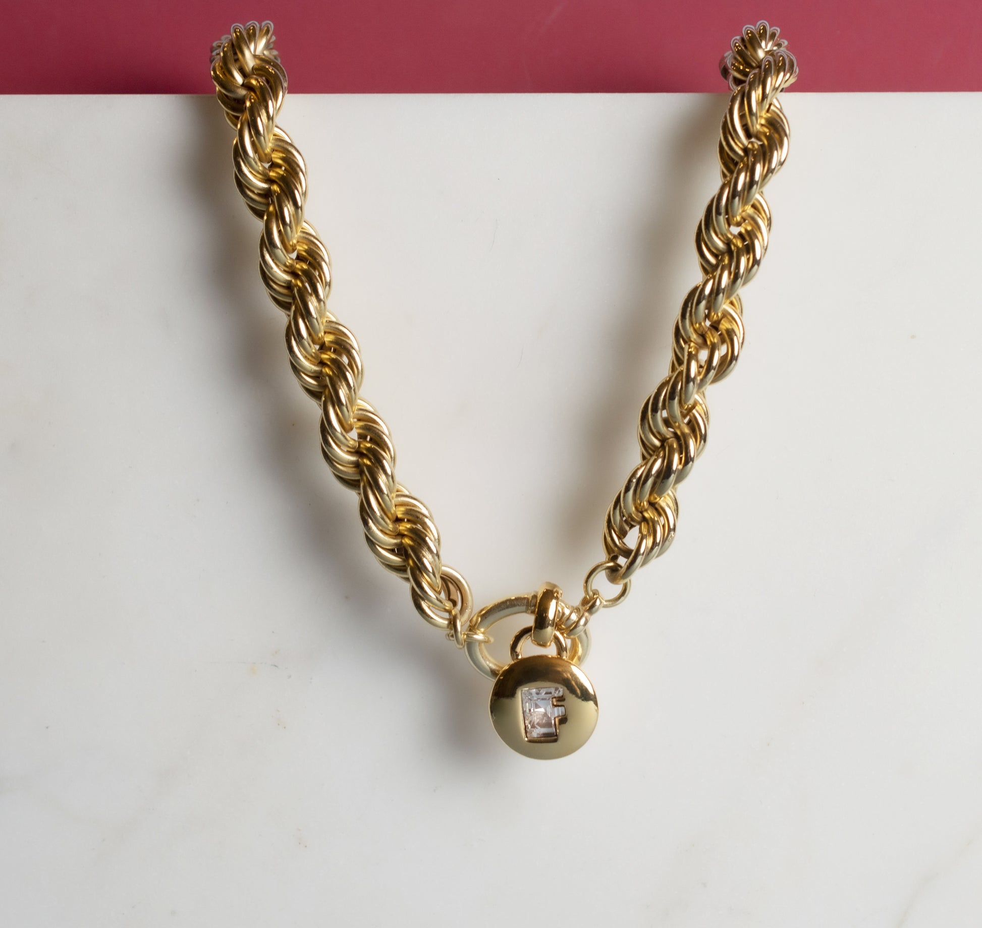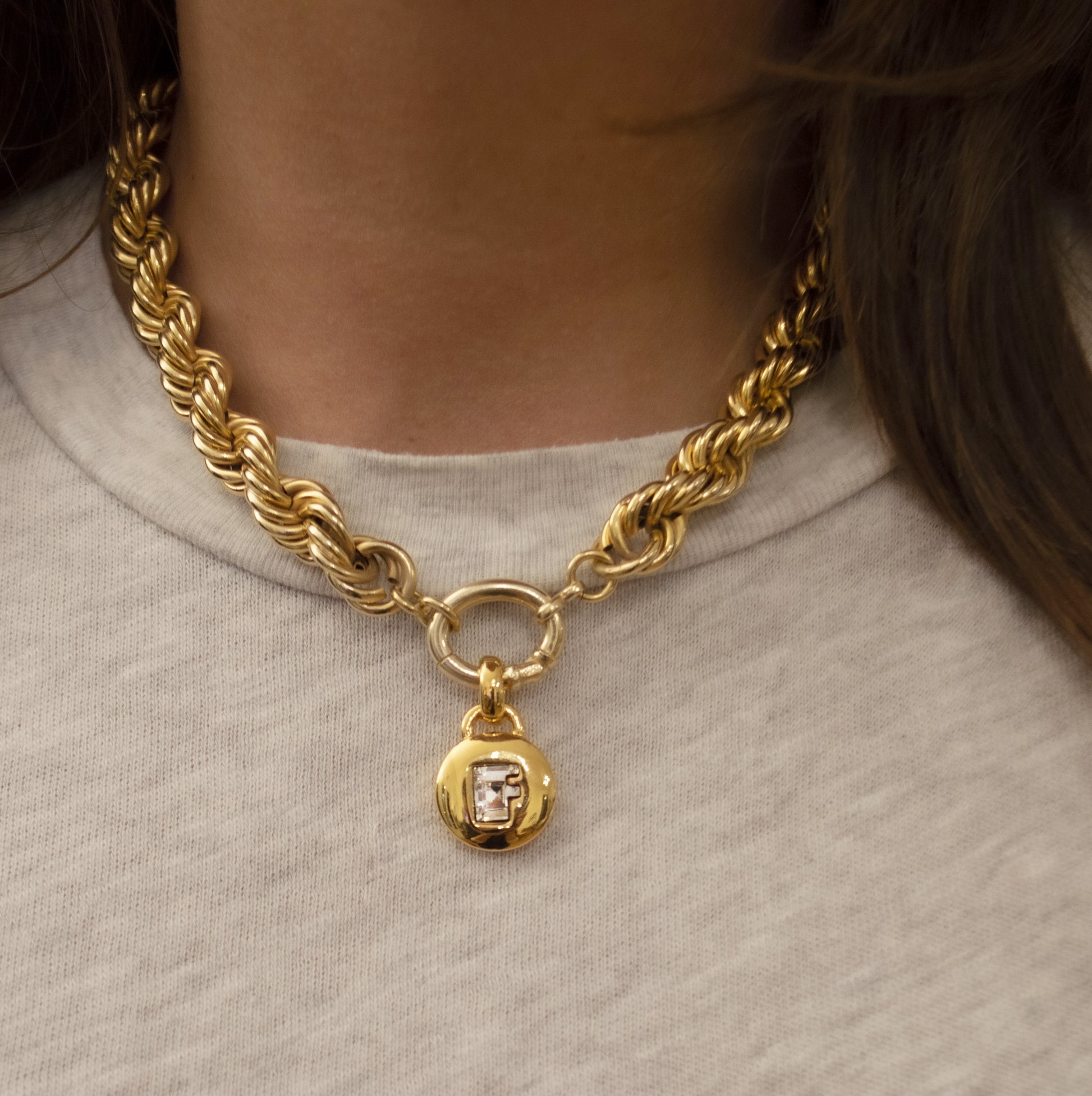 Catena realizzata in ottone dorato in oro 18 carati, chiusura ad anello porta ciondolo in
